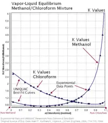 The tendency of a given chemical species to partition itself preferentially between liquid and vapor phases is the Henry's law constant. There can be VLE data for mixtures of four or more components, but such a boiling-point diagram is hard to show in either tabular or graphical form. For such multi-component mixtures, as well as binary mixtures, the vapor–liquid equilibrium data are represented in terms of K values (vapor–liquid distribution ratios)[1][2] defined by