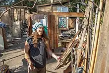 In 1968, the festival moved to its present three-acre site on Laguna Canyon Road, across the street from the established FOA. At this location, Sawdust artists began building, "wildly conceived, mostly wood-built quasi-dwellings, which were heavy on the rustic theme, with no two alike." They also built a wooden, fort-like gate, and spread sawdust or wood chips onto the bare ground.[13]