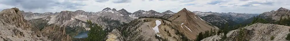 The northern Sawtooth Range formed from the Eocene Sawtooth batholith, while south of Alturas Lake the mountains formed from the Cretaceous granodiorite of the Idaho Batholith.[7][8] The Sawtooth Range has a history of alpine glaciation, but while no surface glaciers exist today, perennial snow fields and rock glaciers remain, usually on north or east facing slopes. There have been 202 perennial snow fields mapped in the Sawtooth Range.[9] The Sawtooth Range was last extensively glaciated in the Pleistocene, but glaciers probably existed during the Little Ice Age, which ended around 1850 AD.[10][11] Evidence of past glaciation given remnants of the glaciers such as glacial lakes, moraines, horns, hanging valleys, cirques, and arêtes.[10]