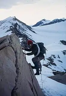Expedition Photo August 1972, showing Kenneth Scaife climbing a rock-face