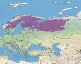 The Scandinavian and Russian taiga is an ecoregion within the taiga and boreal forests biome as defined by the WWF classification (ecoregion PA0608).[1] It is situated in Northern Europe between tundra in the north and temperate mixed forests in the south and occupies about 2,156,900 km2 (832,800 sq mi) in Norway, Sweden, Finland and the northern part of European Russia, being the largest ecoregion in Europe. In Sweden the taiga is primarily associated with the Norrland terrain.[2]