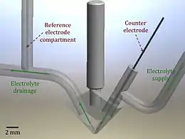SFC utilizes V-formed geometry with a small opening on the bottom (in range of 0.2-1mm diameter) used to establish the contact with sample. The convective flow is sustained also in non-contact mode of operation that allows easy exchange of the working electrode.[1]