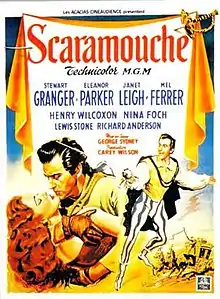 Scaramouche is a 1952 romantic swashbuckler film starring Stewart Granger, Eleanor Parker, Janet Leigh, and Mel Ferrer. Filmed in Technicolor, the MGM production is loosely based on the 1921 novel Scaramouche by Rafael Sabatini as well as the 1923 film version starring Ramon Novarro. It was directed by George Sidney and produced by Carey Wilson from a screenplay by Ronald Millar and George Froeschel. The original music score was composed by Victor Young and the cinematography by Charles Rosher.