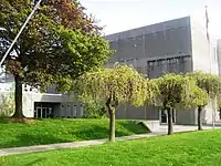 Until 1973, the board offices was also located at Scarborough Municipal Offices at 2100 Eglinton Avenue near Birchmount Road (built after World War II now demolished and site of parking lot). The new SBE administrative offices, located at 2466 Eglinton Avenue East (northside of Eglinton and west of Midland Avenue) and designed by architect Harold Carter, were built in 1954 and administrative operations were relocated in 1973. The former building was declared redundant by 1986 and was replaced by Rainbow Village condos in 1990.[32]