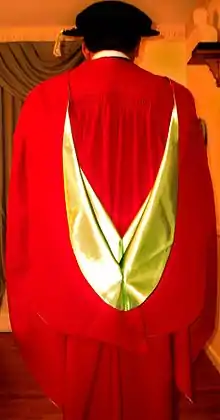 Scarlet is the color worn in traditional academic dress in the United Kingdom for those awarded doctorates. It is also the color of many of the undergraduate gowns worn by students of the ancient universities of Scotland.
