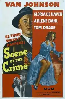 Scene of the Crime is a 1949 American film noir directed by Roy Rowland, starring Van Johnson, and featuring Gloria DeHaven, Arlene Dahl, and Tom Drake.[3] The film's screenplay, by Charles Schnee, is based on a non-fiction article by John Bartlow Martin, "Smashing the Bookie Gang Marauders". It was the only property sold by Martin to be made into a film.[4] Scene of the Crime was producer Harry Rapf's last film of his thirty-plus year career; he died of a heart attack a week after principal photography for the film began.[1]