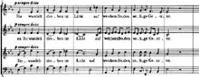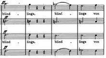 The orchestra returns to prominence at measure 52 with harplike accompaniment as the chorus presents a new melody to the line Wie die Finger der Künstlerin Heilige Saiten. At measure 64, the orchestra cadences in the dominant key (B major) before repeating the first thematic melody line originally stated by the alto voices.