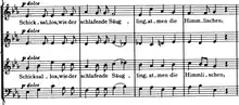 The Schicksalslied (Song of Destiny), Op. 54, is an orchestrally accompanied choral setting of a poem written by Friedrich Hölderlin and is one of several major choral works written by Johannes Brahms. Brahms began the work in the summer of 1868 at Wilhelmshaven, but it was not completed until May 1871.[1] The delay was primarily due to Brahms's hesitation over how the piece should end. Hesitant to make a decision, he began work on the Alto Rhapsody, Op. 53, which was completed in 1869 and first performed in 1870.[2]