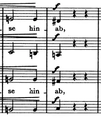 Brahms completed an initial setting of Hölderlin's two verses in ternary form with the third movement being a complete restatement of the first.[6] However, Brahms was dissatisfied with this full restatement of the first movement to close the piece, as he felt that it would nullify the grim reality depicted in the second movement.[6] This conflict remained unresolved, and Schicksalslied unpublished, while Brahms turned his attention to the "Alto Rhapsody" from 1869–70. The piece was not realized in its final form until a solution was suggested to Brahms in 1871 by Hermann Levi (who conducted the premiere of Schicksalslied later that year).[1] Levi proposed that in lieu of a full return of the first movement, a reintroduction of only the orchestral prelude should be used to conclude the piece. Convinced by Levi, Brahms composed the third movement as a copy of the orchestral prelude in the first movement with a richer instrumentation and transposed into C major.[4] While Brahms was hesitant to break the desperation and ultimate futility of the second movement by bringing a blissful return to the first, some see Brahms's return to the orchestral prelude as "a desire on the part of the composer to relieve the gloom of the concluding idea of the text by shedding a ray of light over the whole, and leaving a more hopeful impression".[1]
