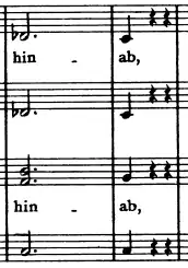 The first movement, marked Adagio, is in common time and begins in E major.[4] The piece opens with 28 measures of an orchestral prelude (which Brahms later re-orchestrates in the third movement). At measure 29, the altos enter with the initial statement of the choral melody, which is immediately reiterated by the sopranos while the rest of the chorus adds harmony.