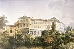 Under Franziska von Hohenheim, the dowager suite was made up of an enfilade of six rooms on its south side, and five rooms, hall, and a staircase on its north end. The southern portion was later expanded with two rooms,[17] the Garden Rooms, built from wood which was then on top of a casemate.[18] A watercolor painting made 14 years after Franziska's death show the walls as being covered by blue wallpaper with white curtains. Henriette von Nassau had the floors covered with vibrant carpets and new furniture, and covered the walls with new wallpaper and framed paintings.[17] Henriette also had the Garden Room rebuilt in brick to make it habitable in the winter, and filled it with keepsakes.[18]