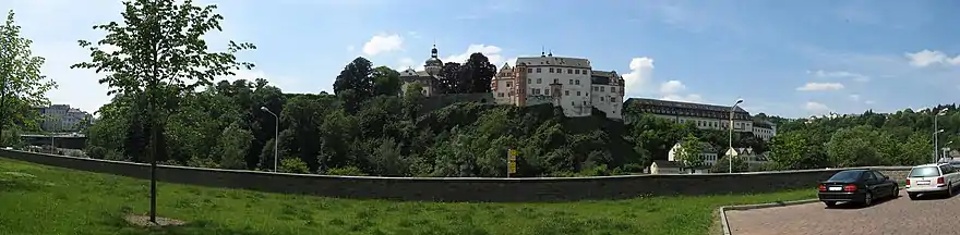 ![]() Aerial view of the palace and its church and gardens above the Lahn river (from the northeast) | |