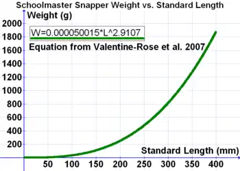 Invariably, b is close to 3.0 for all species, and c varies between species. A weight-length relationship based on 100 schoolmaster snapper ranging in length from 2 to 7 in (50 mm to 180 mm) found the coefficient c was 0.000050015 and the exponent b was 2.9107. This relationship suggests a 12.5-inch schoolmaster snapper (320 mm) will weigh about 2.2 lb (1 kg).[11]