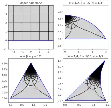 The upper half-plane, and the image of the upper half-plane transformed by the Schwarz triangle function with various parameters.
