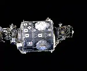 The first module of the ISS, Zarya, was launched on 20 November 1998 on an autonomous Russian Proton rocket. It provided propulsion, attitude control, communications, and electrical power, but lacked long-term life support functions. A passive NASA module, Unity, was launched two weeks later aboard Space Shuttle flight STS-88 and attached to Zarya by astronauts during EVAs. The Unity module has two Pressurised Mating Adapters (PMAs): one connects permanently to Zarya and the other allowed the Space Shuttle to dock to the space station. At that time, the Russian (Soviet) station Mir was still inhabited, and the ISS remained uncrewed for two years. On 12 July 2000, the Zvezda module was launched into orbit. Onboard preprogrammed commands deployed its solar arrays and communications antenna. Zvezda then became the passive target for a rendezvous with Zarya and Unity, maintaining a station-keeping orbit while the Zarya–Unity vehicle performed the rendezvous and docking via ground control and the Russian automated rendezvous and docking system. Zarya's computer transferred control of the station to Zvezda's computer soon after docking. Zvezda added sleeping quarters, a toilet, kitchen, CO2 scrubbers, dehumidifier, oxygen generators, and exercise equipment, plus data, voice and television communications with mission control, enabling permanent habitation of the station.[108][109]