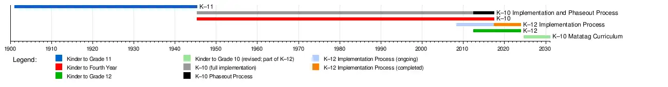 The K–12 educational system—one year of Kindergarten, six years of elementary education, four years of junior high school education, and two years of senior high school education—started to be implemented on School Year (SY) 2012–2013 in June 4, 2012; the K–12 also included a new curriculum for all schools nationwide.[59][60][61] To guarantee continuity of the K–12 Program in the succeeding years, Kindergarten was formally made compulsory by the Kindergarten Education Act of 2012,[62] while the further twelve years were institutionalized by the Enhanced Basic Education Act of 2013.[63] The 1945 K–10 system was entirely phased out on June 5, 2017 upon implementing K–12 in Grade 6, ending the 9-year implementation process of the K–12 curriculum that spanned from the administrations of Gloria Macapagal-Arroyo to Rodrigo Duterte.