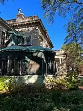 The historic Marble House in Newport, Rhode Island was chosen as inspiration for the Richmond structure, which was itself modeled after the Petit Trianon in Versailles. It stands proudly removed from West Franklin, an exception to the block's density. The stately house, a handsome combination of limestone and terra cotta, is grounded by green-tiled wrapping terraces and a porte-cochére, shaded by trees in the house's garden. Oxidized copper and careful cast iron work beautifully balance the gravity of the building's exterior. Oversized fluted columns with Corinthian capitals give the mansion a sense of monumentality. The interior is a classic example of the American Renaissance style, originating in the 18th century. The occupant moves through the public, symmetrically divided rooms with no hallways on the first floor, structured around a main entrance stair which lies under a magnificent stained glass dome. Servants’ quarters are to the rear of the building, and a large English style carriage house is hidden behind the mansion. The Anderson Gallery, constructed in 1888 from the former Ginter House stables, also stands behind the Scott-Bocock House. The splendor of the structure is a reminder of Richmond's insurance-and-banking glory days in the early 20th century, when it was an indulgent capital of the South.[5]
