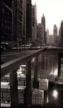 Some of his most famous works include a montage of fans using flashlights to illuminate Wrigley Field, which was then known for not having lights or night games; a photo of Michigan Avenue skyscrapers superimposed upon an image of the card catalogue at the University of Illinois Library; and a forest growing out of a parquet floor.[2]