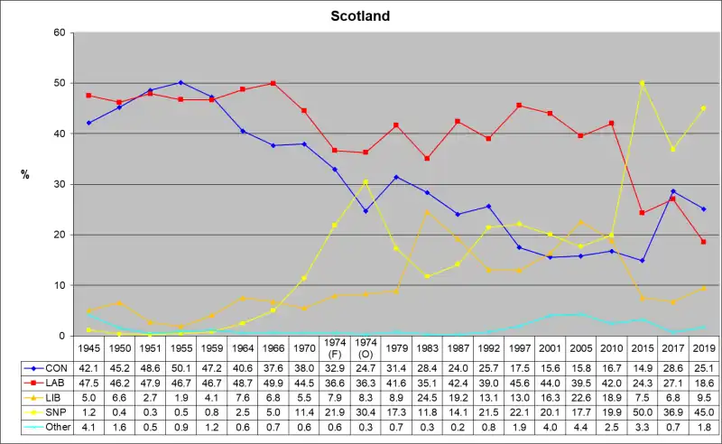 The aggregate votes of all Scottish constituencies for the 2019 general election are as follows: