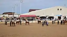 As of 2015, the show consisted of competition in multiple divisions: Mounted Native Costume; Breeding/Halter; Dressage; Driving; working western (Reining, cutting, Working cow horse), English Pleasure (including show hack, park horse, and country English pleasure); Hunter/Jumper and hunter under saddle; Liberty (featuring a horse running free with accompanying music); and Western Pleasure as well as a youth division for most classes.[9][6] The top prize of the show is "Scottsdale Supreme Halter Champion".[10] This prize is given both to a mare and a stallion champion.[11] Crowds at the event have exceeded 200,000.[6] In 2015, over 320,000 visitors attended the 11 days of the event, with an additional 450,000 viewers around the world over a live television feed.[12] A unique feature of the show is the user-friendly instructions which allow spectators to better understand the scoring system of the judges.[6]