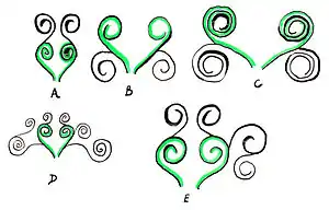 In other types the heart-shaped core is omitted, the scroll taking the form of an "S" with voluted ends, generally seen in confronted pairs, as in the mosaics of the Treasury of the Great Mosque of Damascus, Byzantine work of the 7th century. This form is also encountered at the Treasury in Damascus, having a pair of volutes turned inwards towards the bowl. The form is generally used alone and does not sprout further volutes as generally does the core heart-shaped form.