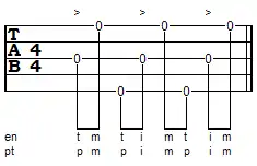 - ↑ Hohwald, Geoff (1988). Banjo Primer, p.14. ISBN 1-893907-32-5. Shown without rhythm.