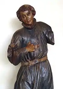 The dating and identification of authorship are invariably difficult, if not impossible in most cases. The general working habit was cooperative, and no work was signed or dated by the authors. Some, however, were attributed to one priest or another, as several were established artists, among them Giuseppe Brasanelli, Francisco Ribera, and Anton Sepp, who have created or designed some of the most sophisticated pieces that still remain today.[45] In Sustersic's opinion, Father Brasanelli was a determining figure in the formation of the "missionary style," and that "nothing produced in the Guarani missions was immune to his labor, his teaching, or his influence." Josefina Plá proposed the identification of at least forty images as coming from the hands of Brasanelli or his immediate circle (not all of them in Brazil, since the priest traveled to various towns in the Province of Paraguay). The only work that can be safely attributed to him by documentary testimony is the kneeling Saint Francis of Borja, which is preserved (heavily repainted) in the Cathedral of São Borja, and which served as the basis for the other identifications.[54] Another important figure was Father Anselmo de la Matta, who, for Damasceno, was responsible for turning the settlement of São Nicolau into a center for exporting artworks to other peoples.[55] More than two thousand Jesuits passed through the Province of Paraguay, half of them Spanish, and the rest from 32 other nationalities, which attests to the great role of the international contribution to the missionary enterprise in Paraguay. There was also some artistic exchange between the Seven Peoples and the missions in Peru. From these different nations, the Jesuits brought to the Missions the style in vogue in their countries, without forgetting medieval, Romanesque, or Gothic references. The fusion of all these influences enabled the creation of an eclectic and peculiar Baroque.[56][57]