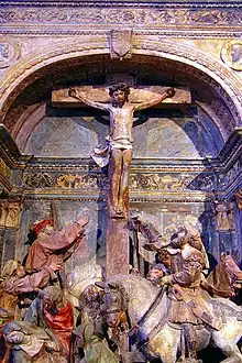 The Romanesque church of Saint-Gengoult in Briey dates back to the beginning of the 12th century and holds a Ligier Richier calvary with life size depictions of Christ on the Cross, with the two robbers on either side.[9] The Briey composition features Jesus on the central cross with the good sinner on one side and the bad sinner on the other. Richier adds to his composition the figures of the Virgin Mary, Mary Magdalene and St John. The work is thought to date to 1534 and was originally made by Richier for the Oratory of Jean Milet which was located in the old Briey cemetery. Jean Milet was a native of Briey and the vicar of La Chaussée. The oratory was destroyed in 1868 and the Calvary finally moved to the church in 1947 after a period when it was kept in a chapel in the new Briey cemetery. This chapel in the new cemetery was where the priests of the parish were buried.[3][10]
