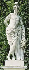 | 18 | Mercury | Ignaz Platzer | Mercury was the god of eloquent speech and was often shown wearing a winged hat and shoes, and carrying a caduceus or herald's staff with two entwined snakes.[29] The son of Maia and Jupiter, the god of trade and the primary god of the Roman state religion, Mercury gave his name to the element "mercury" because of his apparent swiftness and speed.[29] He was also thought of as a mediator between human and divine wisdom.[29] | ![]() |