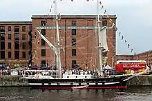 She is rigged as a 34m brig,[17] with a sail area of 536 square metres (641 sq yd). Her draught is 3.25 metres (10 ft 8 in).[18] The ship's hull is of high tensile steel, with her superstructure of glass reinforced plastic. She has a crew of eight, plus up to twenty-four Cadets and two adult trainees. Twelve passengers can also be carried.[19]