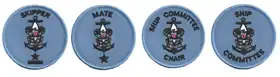 With the publication of the 2012 Sea Scout Manual, the rope diamond and rope oval around the Sea Scout emblem were discontinued for the committee chairman and committee member respectively. All adult leadership above the Ship level use the standard Sea Scout Badge no matter their position. At the ship level, the Skipper is indicated by a star and bar ( *|) below the Sea Scout badge, while the mate (Skipper's assistant leaders), have just a star (*).
