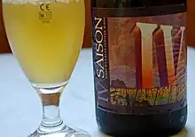 Saison (literally the French translation of season) has been described as a summer seasonal beer.[6][7] As a beer style, the saison originated from ales brewed during the cooler and less active months in farmhouses in Wallonia, the French-speaking region of Belgium, and then stored for drinking by the farm workers during the summer months.[8] General characteristics include a fruity flavor and smell, light or bitter hoppiness, pale orange body, thick head, and a light- to medium-body.[7]