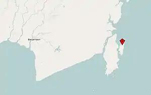 Sebuku is located to the south-east of Borneo, approximately 5 kilometres (3.1 mi) from Laut Island. It is roughly 35 kilometres (22 mi) from north to south and 10 kilometres (6.2 mi) from east to west at its widest point,[1] covering a total area of 275 square kilometres (106 sq mi). Administratively, it is part of South Kalimantan, Indonesia.[2] It is on the Kanibungan Fault.[1]