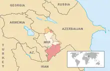The First Nagorno-Karabakh War resulted in the displacement of approximately 725,000 Azerbaijanis and 300,000–500,000 Armenians from both Azerbaijan and Armenia.[141] The 1994 Bishkek Protocol brought the fighting to an end and resulted in significant Armenian territorial gains: in addition to controlling most of Nagorno-Karabakh, the Republic of Artsakh also occupied the surrounding Azerbaijani-populated districts of Agdam, Jabrayil, Fuzuli, Kalbajar, Qubadli, Lachin and Zangilan.[142] The terms of the Bishkek agreement produced a frozen conflict,[143] and long-standing international mediation attempts to create a peace process were initiated by the OSCE Minsk Group in 1994, with the interrupted Madrid Principles being the most recent iteration prior to the 2020 war.[144][145] The United Nations Security Council adopted four resolutions in 1993 calling for the withdrawal of "occupying forces" from the territories surrounding Nagorno-Karabakh,[146] and in 2008 the General Assembly adopted a resolution demanding the immediate withdrawal of Armenian occupying forces,[147] although the co-chairs of the OSCE Minsk Group, Russia, France and USA, voted against it.[148]
