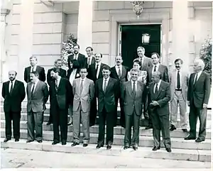 The Council of Ministers was structured into the offices for the prime minister, the deputy prime minister and 15 ministries.[5][6] The number of ministries was increased to 17 with the creation of the Ministry of Social Affairs and the Ministry of the Spokesperson of the Government in July 1988.[7]