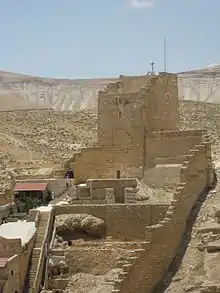 During a trip to Jordan, Israel, Turkey, and Greece in the summer of 1958 "hunting for collections of manuscripts",[44] Morton Smith also visited the Greek Orthodox monastery of Mar Saba[45] situated between Jerusalem and the Dead Sea.[46] He had been granted permission by the Patriarch Benedict I of Jerusalem to stay there for three weeks and study its manuscripts.[47][43] It was while cataloguing documents in the tower library of Mar Saba, he later reported, that he discovered a previously unknown letter written by Clement of Alexandria in which Clement quoted two passages from a likewise previously unknown longer version of the Gospel of Mark, which Smith later named the "Secret Gospel of Mark".[7] The text of the letter was handwritten into the endpapers of Isaac Vossius' 1646 printed edition of the works of Ignatius of Antioch.[lower-alpha 2][7][6][8][9] This letter is referred to by many names, including the Mar Saba letter, the Clement letter, the Letter to Theodore and Clement's letter to Theodore.[48][49][50][51][52][53]
