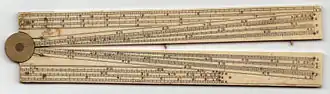 The two earliest known sectors in England were made by Robert Beckit and Charles Whitwell, respectively, both dated 1597. These have a strong resemblance to the description of the device given by English mathematician Thomas Hood's 1598 book.[3] The sector Hood described was intended for use as a surveying instrument and included sights and a mounting socket for attaching the instrument to a pole or post, as well as an arc scale and an additional sliding leg. In the 1600s, the British mathematician Edmund Gunter dispensed with accessories but added additional scales, including a meridian line with divisions proportional to the spacing of latitudes along a meridian on the Mercator projection,[4] privately distributing a Latin manuscript explaining its construction and use. Gunter published this in English as De Sectore et Radio in 1623.
