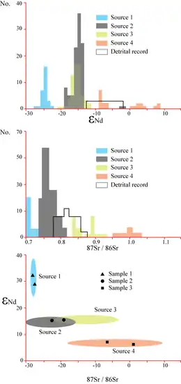 | Bulk sediment Nd and Sr | [31][33] | Nd model age, ultimate protolith or source area[34] |