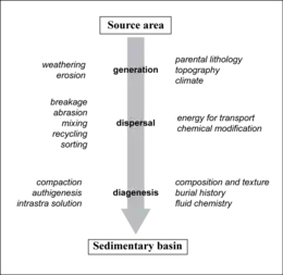 During the pathway of detritus transported from source area to basin, the detritus is subject to weathering, transporting, mixing, deposition, diagenesis and recycling. The complicated process can modify parents lithology both compositionally and textually. All these factors pose certain limits on our capability to restore the characteristics of source rocks from the properties of the produced detrital record. The following paragraphs briefly introduce major problems and limitations of provenance studies.[73]