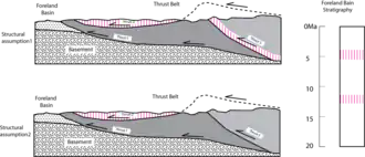 As a provenance study tries to correlate detrital record (which is stored in basins) to hinterland stratigraphy, and hinterland stratigraphy is structurally controlled by fault systems, so hinterland structural setting is important to interpretation of the detrital record. Hinterland structural setting is estimated by field mapping work. Geologists work along river valleys and traverse mountain belts (thrust belt), locate major faults and describe major stratigraphy bounded by faults in the area. A geologic map is the product of field mapping work, and cross sections can be constructed by interpreting a geologic map. However, a lot of assumptions are made during this process, so the hinterland structural settings are always assumptions. And these assumptions can affect interpretation of detrital record. Here is an example, the right figure shows a classic thrust belt and foreland basin system, the thrust fault carries overlying rocks to the surface and rocks of various lithology are eroded and transported to deposit at the foreland basin. In structural assumption 1, the pink layer is assumed to exist above thrust 2 and thrust 3, but in the 2nd assumption, the pink layer is only carried by thrust 2. Detrital records are stored in foreland basin stratigraphy. Within the stratigraphy, the pink layer is correlated to the hinterland pink layer. If we use structural assumption 2, we can interpret that thrust 2 was active about 12 and 5 million years ago. But when using the other assumption, we couldn't know if the pink layer record indicates activity of thrust 2 or 3.