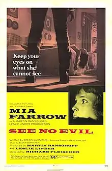 See No Evil (released in the United Kingdom as Blind Terror) is a 1971 psychological horror-thriller film directed by Richard Fleischer and starring Mia Farrow as a recently blinded woman who is stalked by a psychopath while staying at her family's rural estate. Fleischer called the film "sheer entertainment" made "to scare the hell out of audiences."[3]