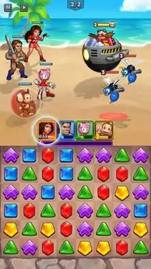 Sega Heroes was a match 3 game, where the player had to match three or more tiles or shapes of the same color to score points and defeat enemies on the field. There were five different colored tiles and four of them that could control a character's actions and abilities. The player had to select four characters of different colors (blue, green, red and yellow) in order to battle enemies in an event. Depending on the color of the character, the tiles that were matched determined if a character attacked an opponent. If the player matched three or more tiles of the same color together, it resulted in the hero of that color gaining energy and attacking an enemy of choice. The tiles came in four separate colors (for each color-type); red, green, yellow and blue, as well as purple for boost. Matching purple tiles together increased the multiplier, resulting in the selected heroes becoming stronger. Matching four tiles together created a star tile, while matching six tiles together created another type of Star tile that exploded a piece of the board and activated a different ability. The MAX ability triggered a character's special move.
