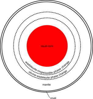 Martian mantle research has also identified two discontinuities at depths of approximately 1100 km and 1400 km. These discontinuities suggest phase transitions from olivine to wadsleyite and from wadsleyite to ringwoodite, analogous to the Earth's mantle phase changes at depths of 410 km and 660 km.[31] However, Mars's mantle composition differs from Earth's as it does not have a lower mantle predominated by bridgmanite.[26]