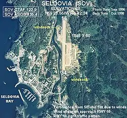 Seldovia Airport is a public-use gravel airstrip serving Seldovia, Alaska, about 15 miles (27 km) south-southwest from the fishing town of Homer at the Kenai Peninsula's "end of the road." The two towns are separated by Kachemak Bay, a blue-water arm of the North Pacific Ocean's Gulf of Alaska. Known to pilots as "Seldovia" (or more formally, (IATA: SOV, ICAO: PASO, FAA LID: SOV)),[2] this public airport is located less than a half-mile (2 km) northeast of the small boat harbor serving Seldovia in the Kenai Peninsula Borough, Alaska, United States. This airport is publicly owned by the State of Alaska Department of Transportation and Public Facilities (DOT&PF) - Central Region.[1] A two-lane gravel street named Airport Avenue leads about a half-mile (1 km) from the airport to the center of Seldovia at the Small Boat Harbor, which is surrounded by several cafes, businesses, and small hotels.