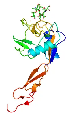 - 1 2 PDB: 1G1R; Somers WS, Tang J, Shaw GD, Camphausen RT (October 2000). "Insights into the molecular basis of leukocyte tethering and rolling revealed by structures of P- and E-selectin bound to SLe(X) and PSGL-1". Cell. 103 (3): 467–79. doi:10.1016/S0092-8674(00)00138-0. PMID 11081633. S2CID 12719907.