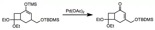 The combination of silyl enol ethers with palladium(II) acetate (Pd(OAc)2), the Saegusa oxidation, gives enones. However, the reaction requires stoichiometric amounts of Pd(OAc)2 and thus is not amenable to large-scale synthesis.[18] Catalytic variants have been developed.[19]