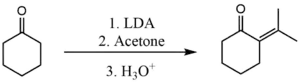 A similar process can also be used to prevent self-condensation between two ketones. In this case, however, the base used needs to be more powerful. A common base used is Lithium diisopropyl amide (LDA). Here it is used in order to perform the crossed condensation between acetone and cyclohexanone.[3]
