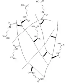 A dangling side chain is a hydrocarbon chain side chains that branch off of the backbone of the polymer. Attached to the side chain are polar functional groups. The side chains "dangle" across the surface of the hydrogel, allowing it to interact with other functional groups and form new bonds.[5] The ideal side chain would be long and flexible so it could reach across the surface to react, but short enough to minimize steric hindrance and collapse from the hydrophobic effect.[5] The side chains need to keep both the hydrophobic and hydrophilic effects in balance. In a study performed by the University of California San Diego to compare healing ability, hydrogels of varying side chain lengths with similar crosslinking contents were compared and the results showed that healing ability of the hydrogels depends nonmonotonically on the side chain length.[5] With shorter side chain lengths, there is limited reach of the carboxyl group which decreases the mediation of the hydrogen bonds across the interface. As the chain increases in length, the reach of the carboxyl group becomes more flexible and the hydrogen bonds can mediated. However, when a side chain length is too long, the interruption between the interaction of the carboxyl and amide groups that help to mediate the hydrogen bonds. It can also accumulate and collapse the hydrogel and prevent the healing from occurring.