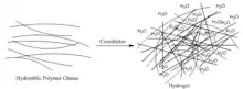 Addition and Condensation Polymerization | ![]() Polymer chains may be crosslinked in the presence of water to form a hydrogel. Water occupies voids in the network, giving the hydrogel its characteristic surface properties |
