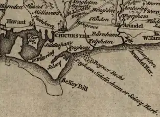 Henry VI granted that lands of Chichester Cathedral should be exempt from the Court of the Admiralty in the manner of wrecks, which meant in effect that any wrecks off Selsey Bill would be the bishop's property.[7] In the 18th century, members of a notorious smuggling gang were captured and tried for the brutal murder of a supposed informant and a customs official, Chater and Galley.[10] Seven were condemned to death at the assizes held at Chichester in 1749 and, after they had been executed at the Broyle, Chichester, two of them were subsequently hung in chains at Selsey Bill, a Yeakel and Gardner map has a Gibbet Field marked on it where it is believed the smugglers hung.[10]
